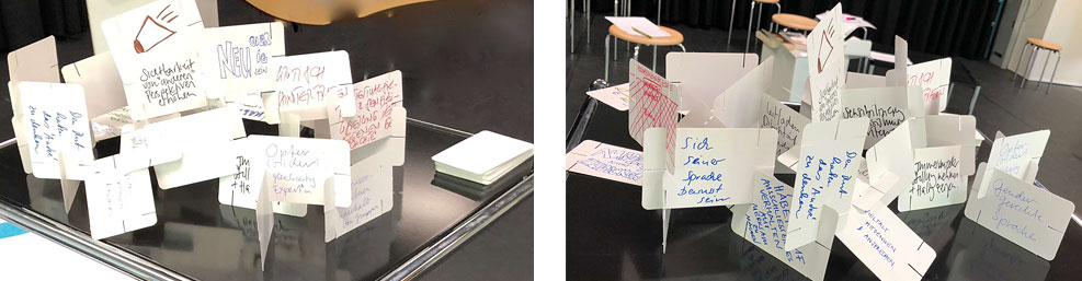 Was will und kann ich in meiner eigenen Praxis/Lehre und Tätigkeit als Gleichstellungbeauftragte und/oder Dozierende an der Hochschule bewegen, weiterreflektieren und umsetzen? Auf Kärtchen wurden die aus den Ateliersequenzen gewonnen Aufmerksamkeiten festgehalten, die den Teilnehmenden in ihren zukünftigen Handlungsräumen an der Hochschule bedeutsam schienen. Die Kärtchen wurden anschliessend zu einem Aufmerksamkeits-Gebilde aufgetürmt und kurz verbalisiert.