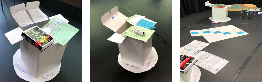 Zunächst individuell, zunehmend auch in kleineren Gruppen, beschäftigten sich die Teilnehmenden mit den Texten und wählten besonders aussagekräftige Sätze aus, um diese – mit dem Ziel der Konstellation neuer Erkenntnisse – neu und anders zusammenzustellen. Ihre Denkbewegungen stellten die Kleingruppen abschliessend auf sehr unterschiedliche Weisen vor (performativ, theatral, erläuternd, etc.). In der Beschäftigung mit den Ausschlüssen und der «Whiteness» von Wissenschaft und Hochschule zeigte sich, dass Leerstellen (Nicht-Wissen) und weisse Flecken entstehen, weil «andere» Wissensformationen und diskriminierungskritische Perspektiven kaum Eingang in den akademischen Kanon finden und nicht-privilegierten Personen der Hochschulzugang institutionell und strukturell erschwert wird.
